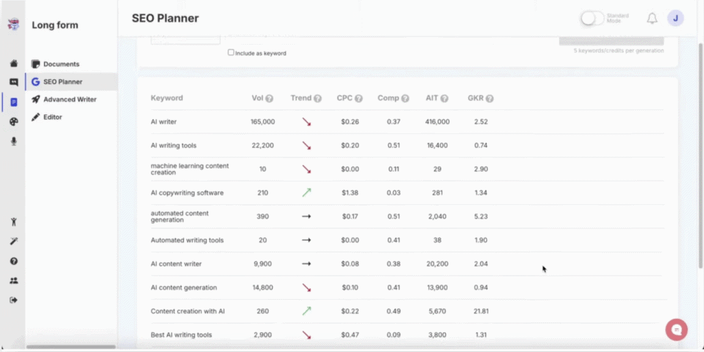 Core features in GravityWrite center on bulk creation and versatility. The platform generates long-form blog posts up to 5,000 words, builds outlines from competitor analysis, and supports ad copy, emails, social posts, and AI image generation. Built-in SEO tools guide structure and topical coverage.