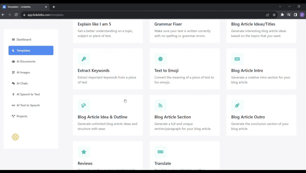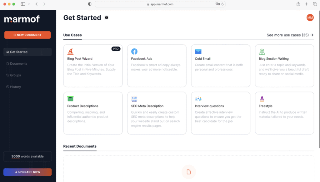 Core features in Marmof focus on straightforward content creation. The platform generates blog posts, articles, emails, social updates, product descriptions, and landing page copy through more than 49 AI use cases. Tone, style, and keyword inputs allow basic customization without complex setup.