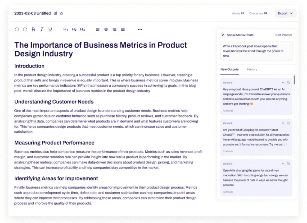 Core features focus on adaptive generation. ChatGPT handles tone variation, long-form drafting, structured rewrites, and idea expansion through prompt-driven dialogue. Articles, outlines, and revisions evolve naturally as instructions change.