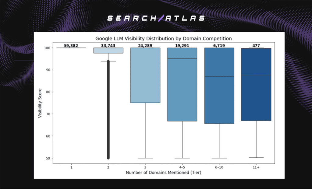 Google maintains near-perfect visibility (~100%) when it is the only cited domain in an LLM response. Visibility remains high across low competition tiers (2 to 5 domains) but gradually declines as domain density increases.