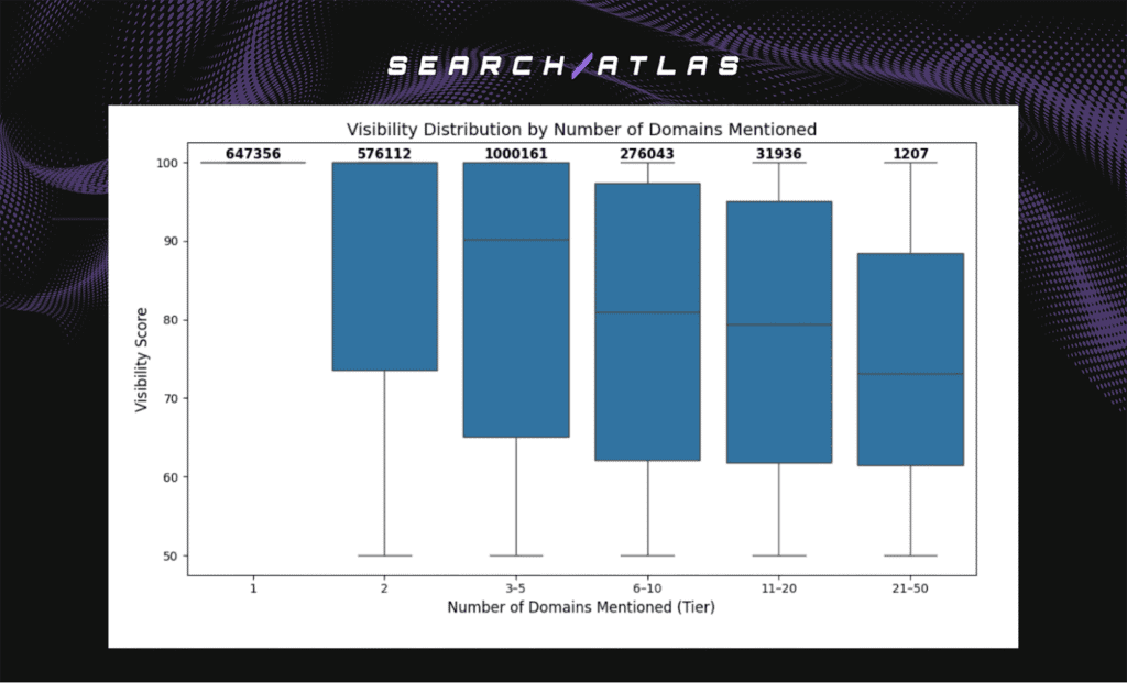 - Beyond ten domains, visibility variance widens as LLMs diversify citations.