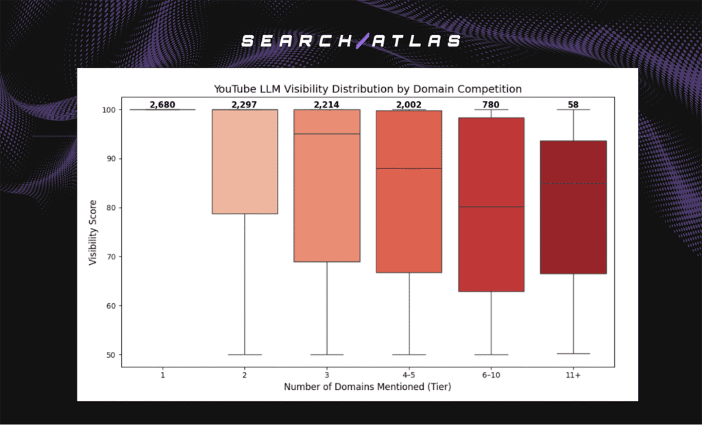 I, Manick Bhan, together with the Search Atlas research team, analyzed Google and YouTube to understand how competition intensity affects visibility across large language model responses. The analysis used all responses where the domains google.com and youtube.com appeared, covering visibility scores between 50 and 100.