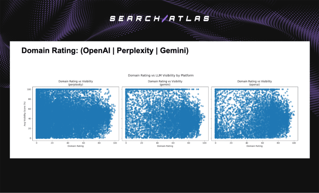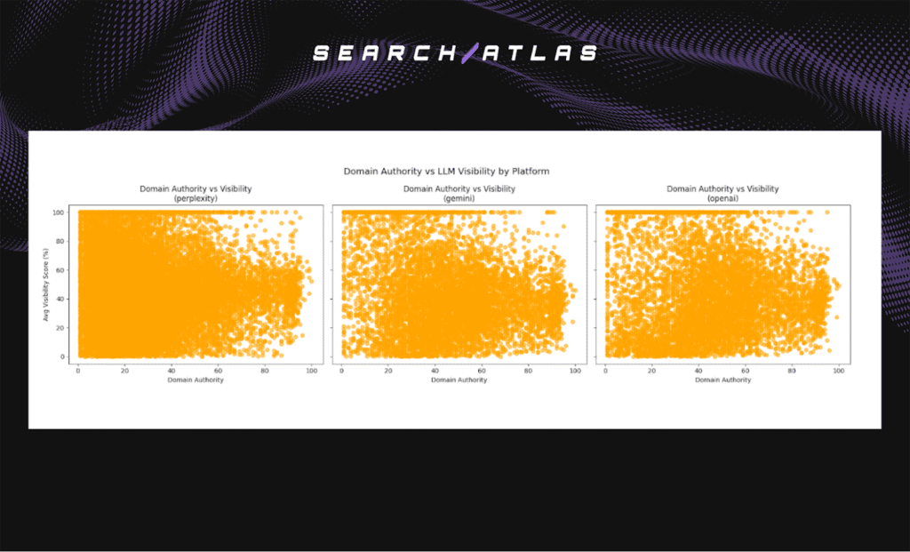 I, Manick Bhan, together with the Search Atlas research team, analyzed correlations between authority metrics and LLM Visibility across 21,767 domains. The breakdown to show how DP, DR, and DA relate to visibility is outlined below.