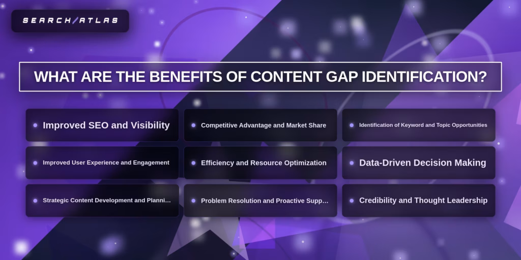 Content gap identification improves organic traffic, engagement, and business performance by expanding keyword coverage, enhancing content quality, and aligning content with search intent. Businesses applying content gap analysis achieve higher rankings, increased impressions, and measurable traffic growth through optimized content, internal linking, and continuous updates. The benefits include improved SEO visibility, stronger competitive positioning, better resource allocation, and data-driven decision-making. Tools (Search Atlas, Semrush, Ahrefs, Moz Pro, MarketMuse) support this process, with Search Atlas providing the most complete system by combining keyword analysis, content optimization, and AI visibility tracking.