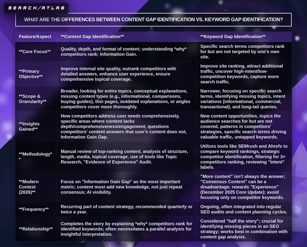 What are the core differences between Content Gap Identification and Keyword Gap Identification? The differences between Content Gap Identification and Keyword Gap Identification are defined by their focus, objectives, scope, insights, methodologies, and strategic roles. The comparison is below.