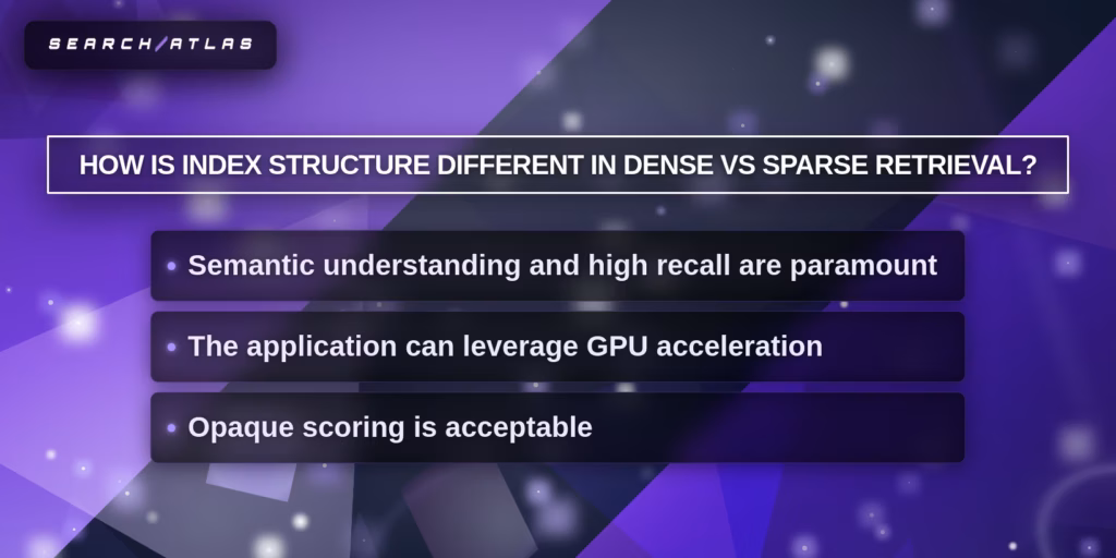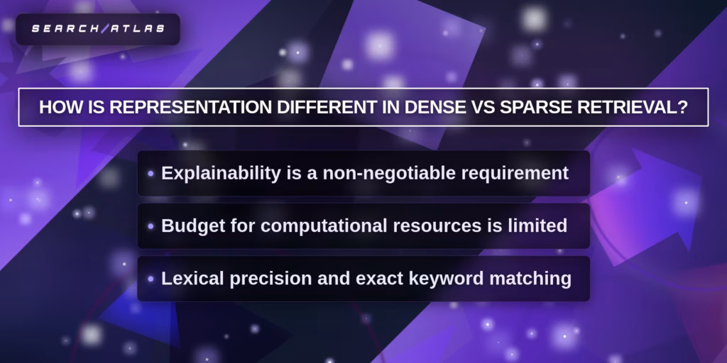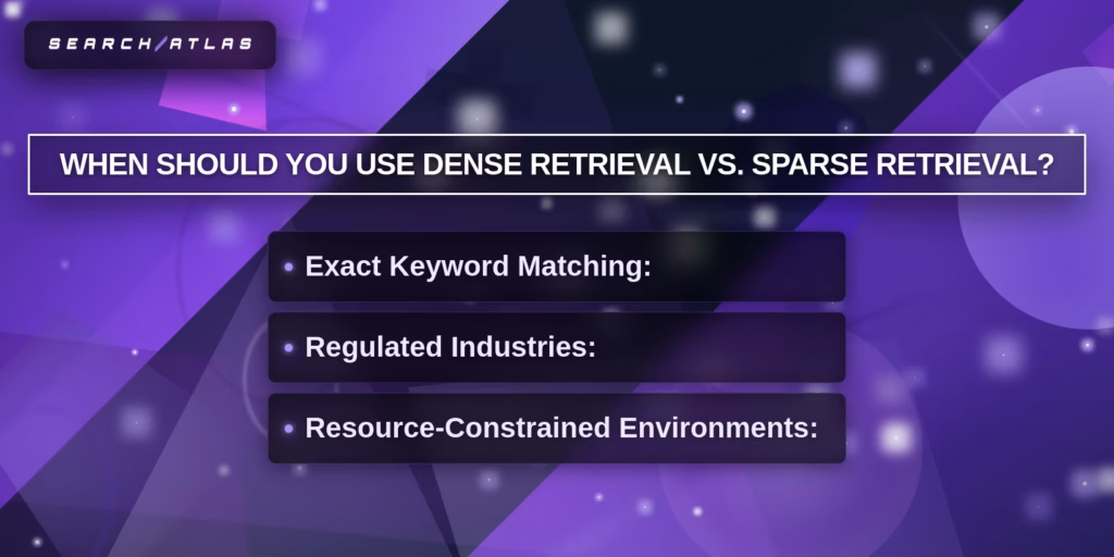 Sparse retrieval fits environments that require transparent ranking (legal, finance, healthcare). Sparse retrieval exposes term-level weights, which enables full auditability and deterministic debugging. - Use Dense Retrieval for Semantic Search (Meaning-Based Scenario).