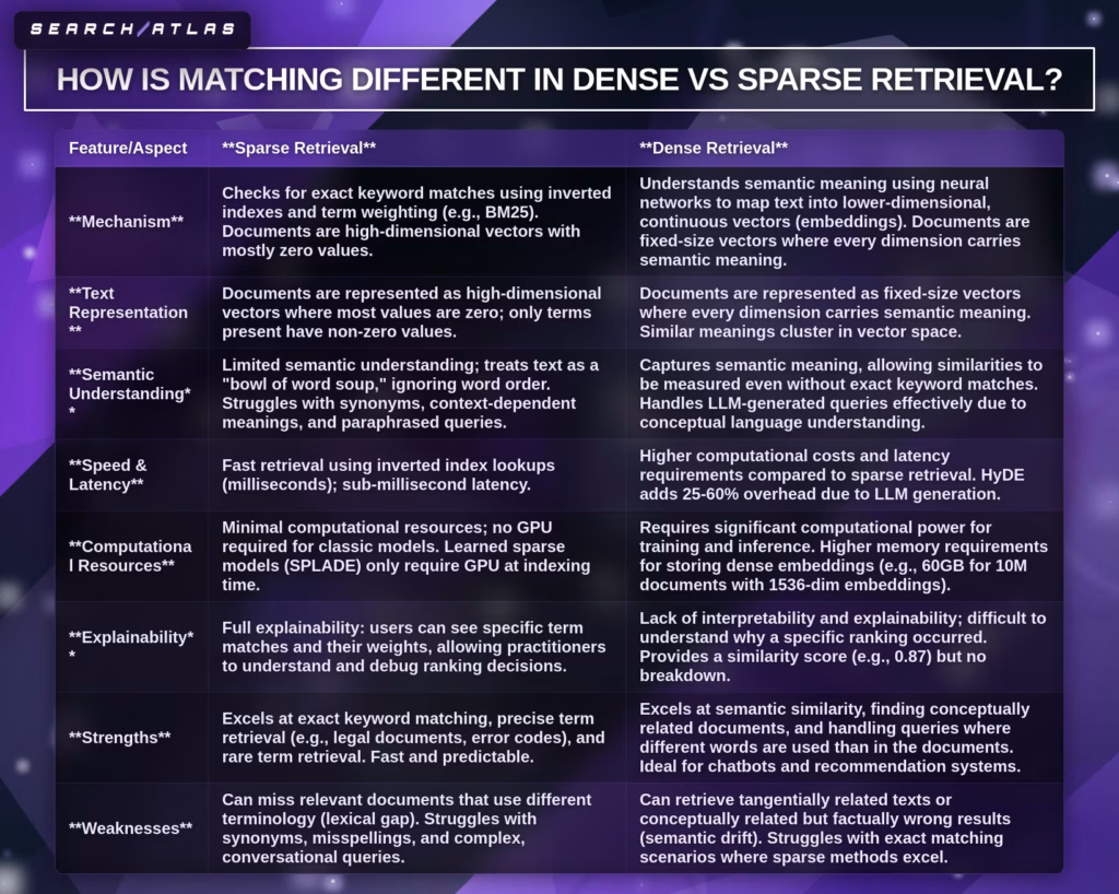 Dense vs sparse retrieval differs in representation, matching, indexing, computation, and performance, where dense retrieval uses semantic search and sparse retrieval uses keyword search. Dense vs sparse retrieval comparison shows that dense retrieval encodes meaning through neural vectors, while sparse retrieval encodes exact terms through weighted token vectors. Semantic search vs keyword search defines the core divide, where dense retrieval focuses on contextual similarity and sparse retrieval focuses on lexical overlap.
