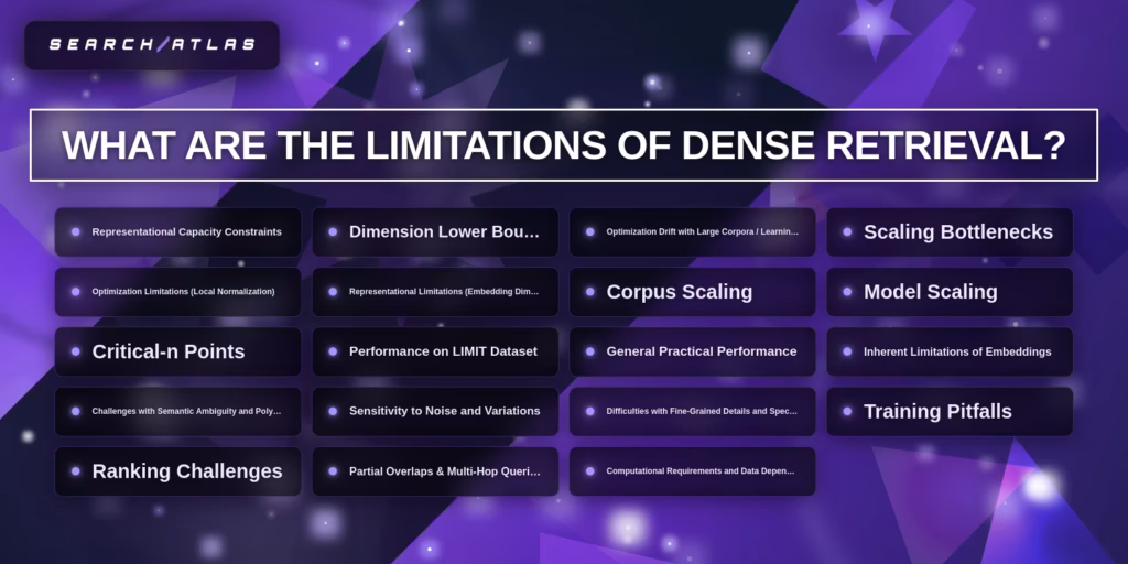 Dense retrieval has limitations in representation, scalability, training, and precision, which restrict dense retrieval performance in exact matching and large-scale systems. Dense retrieval limitations arise from embedding constraints, computational cost, and semantic ambiguity in neural retrieval systems.