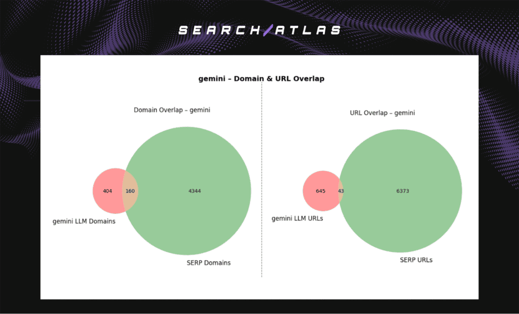 Gemini records 28% domain overlap and 6% URL overlap with Google Search. Despite being a Google-developed model, Gemini references a smaller, more curated set of sources. Its retrieval design favors selectivity and factual precision over citation volume.