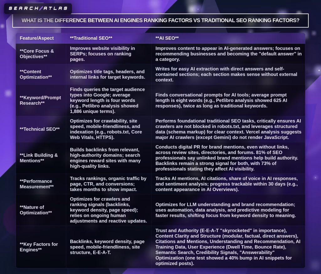 What are the main structural differences between traditional SEO and AI engine optimization? There are 7 main differences between AI engine ranking factors and traditional SEO ranking factors. The comparison is listed below.