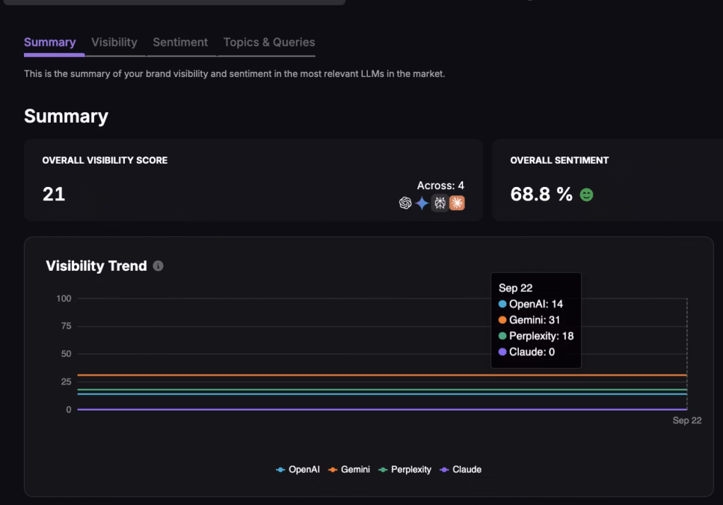 Results display in 4 dashboards called Summary, Visibility, Sentiment, and Topics & Queries. These dashboards show visibility scores, share of voice, sentiment ratings, citation sources, and the queries that trigger mentions.
