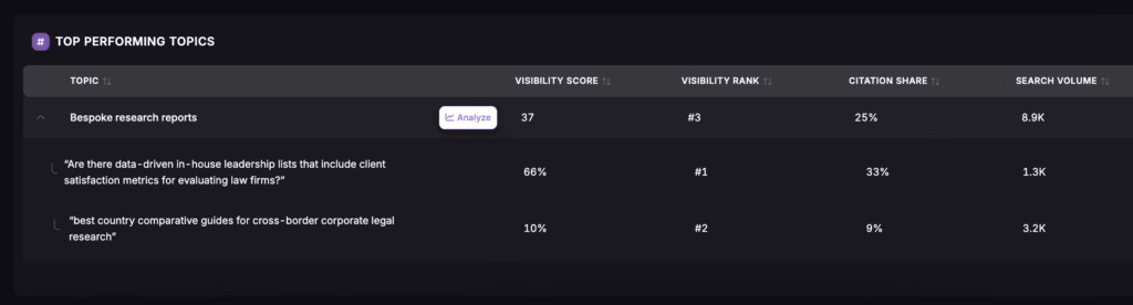 To identify which practice specialties AI associates with your firm, use the Topics & Queries dashboard. This dashboard lists the topics and queries that trigger mentions, along with visibility scores, rankings, citation share, and related search volume.