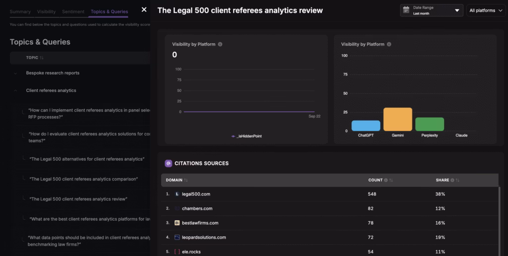 Use the Visibility and Topics & Queries dashboards to benchmark your firm against other specialists in the same field. These dashboards show how often competitors appear in AI-generated answers and which citation sources strengthen their presence.