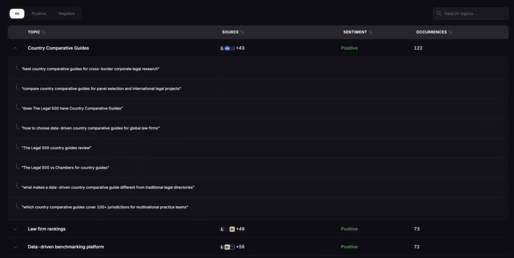 - Protecting the share of voice in competitive markets. AI assistants are becoming a new channel where clients evaluate lawyers. Benchmarks reveal whether rivals dominate mentions and highlight opportunities to grow presence in your market.