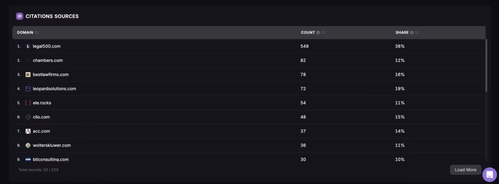 To protect accuracy of office details and reviews, view the Citation Sources chart in the Visibility dashboard. This view lists the directories and profiles referenced in AI-generated answers and reveals whether outdated addresses, inconsistent hours, or old reviews distort how your firm is described.