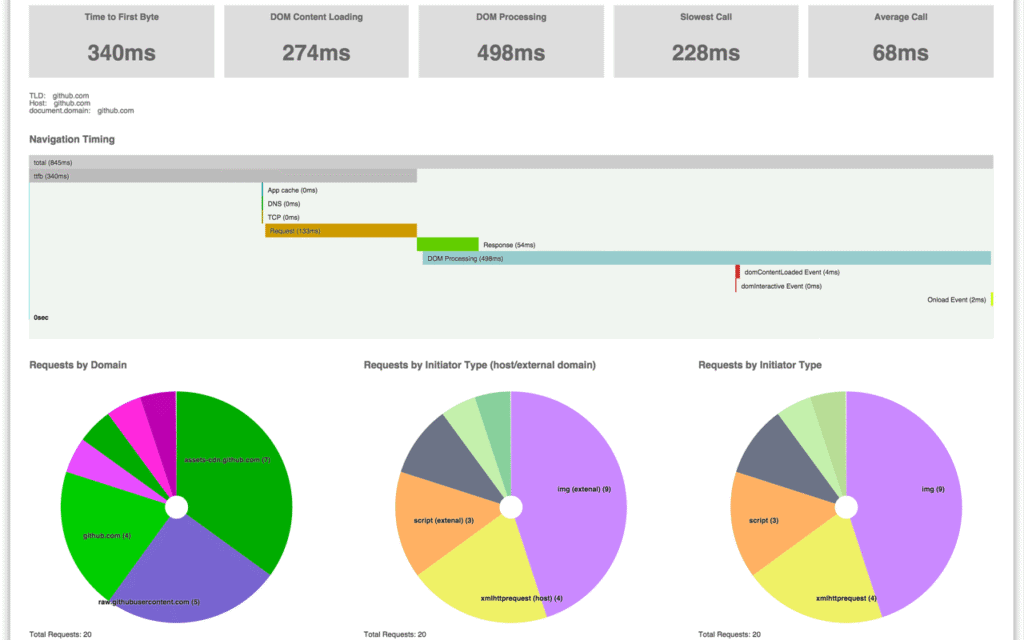 Performance-Analyser was a Chrome extension that provided real-time insight into webpage performance, functioning as a lightweight alternative to WebPageTest. Performance-Analyser analyzed pages through the Resource, Navigation, and User Timing APIs to display requests by type, domain, load time, and user-defined performance marks.