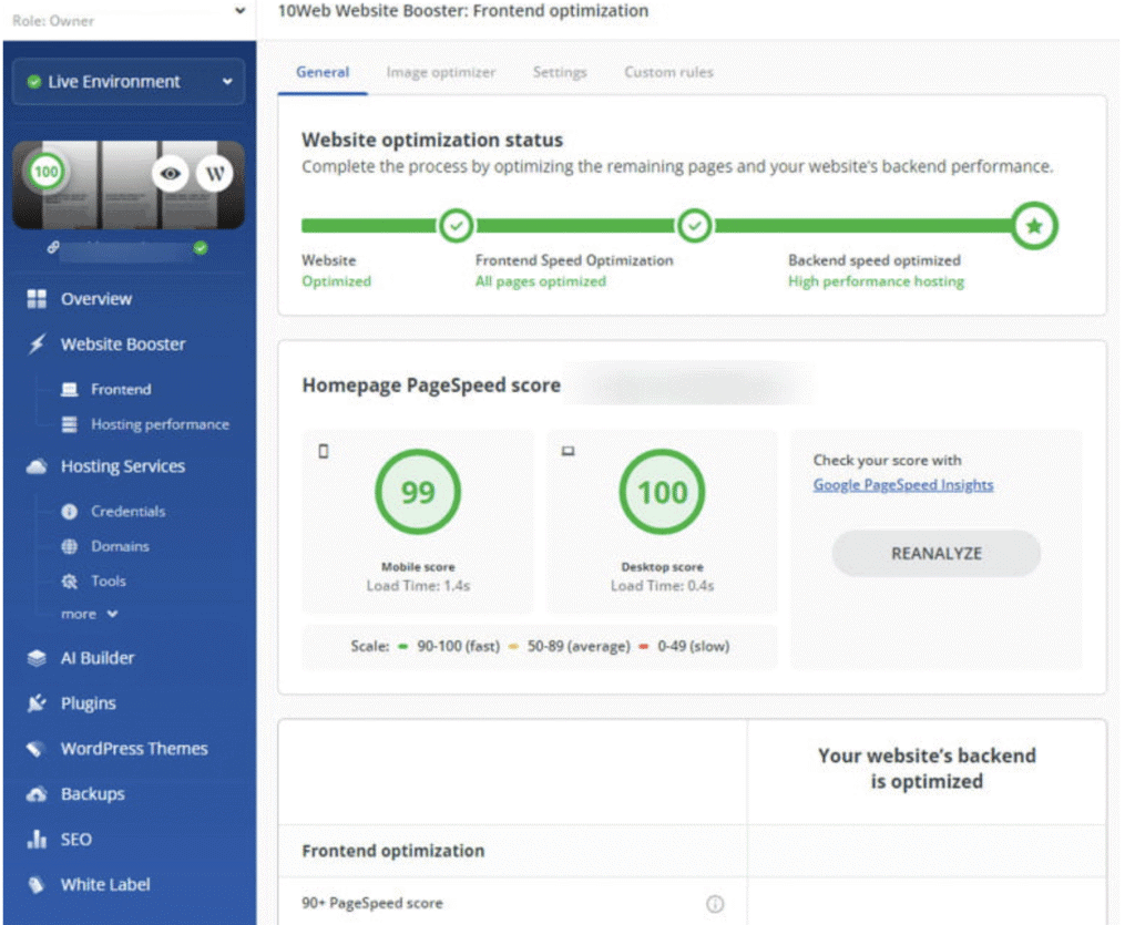 Compared to NitroPack, 10Web Booster focuses more on automated Core Web Vitals optimization. It applies AI-driven analysis to improve LCP, CLS, and FID scores in real time.