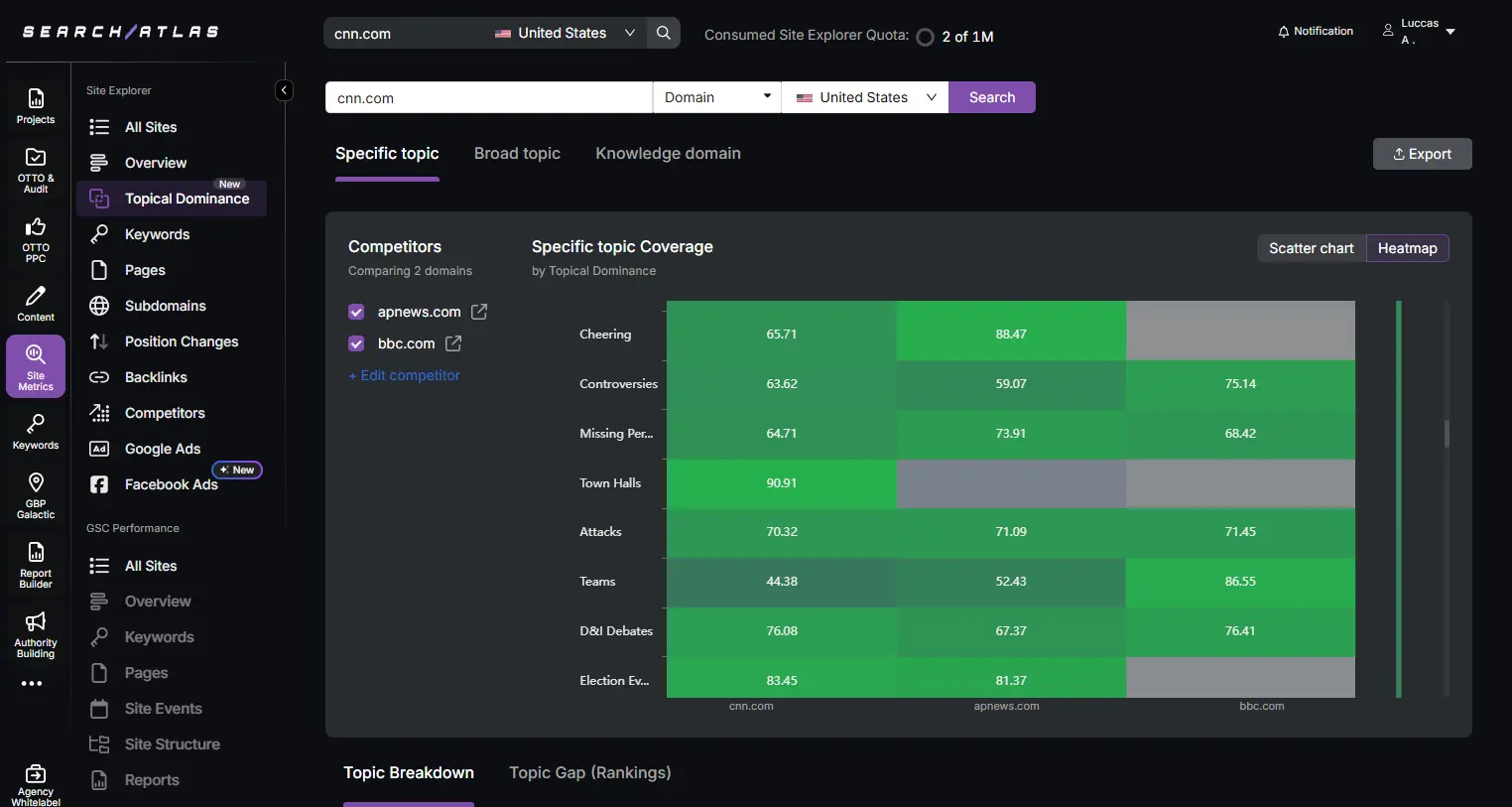 4. The Search Atlas Topical Dominance Tool shows your destination content coverage compared to competing travel businesses.