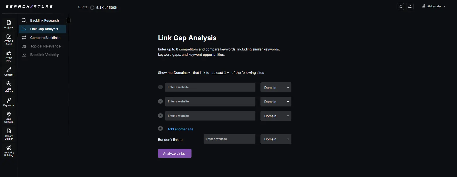 2. The Search Atlas Link Gap Analysis finds websites linking to competitors but not you, revealing partnership opportunities with travel blogs, tourism boards, and destination sites.