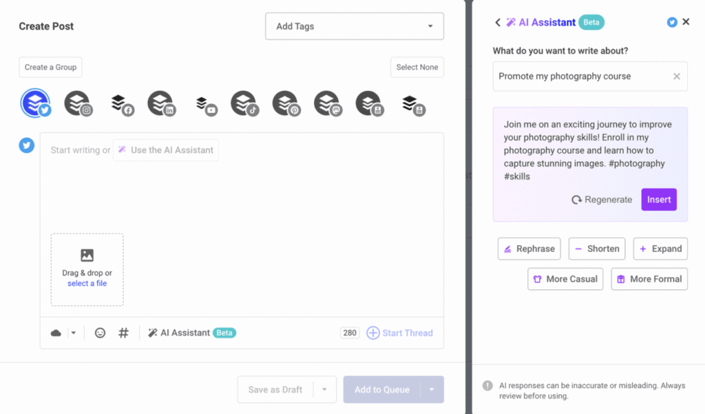| 17 | Buffer AI Assistant | Platform specific social copy | $0 to $10/channel |