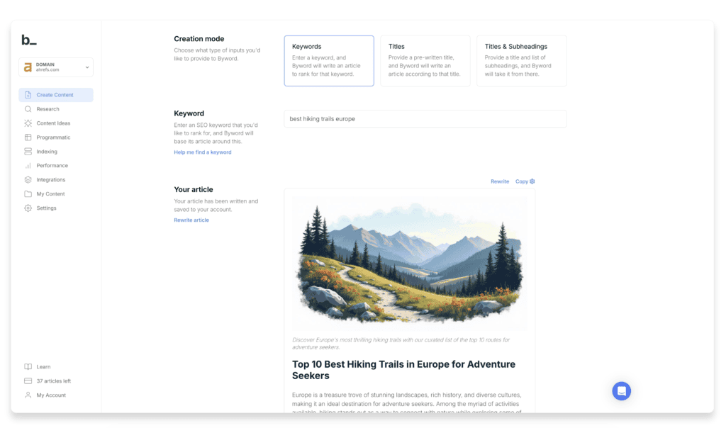 Compared to Anyword, Article Forge operates through automation rather than performance modeling. Article Forge generates entire long-form pages without step-by-step editing, which makes it better suited for high-volume content pipelines rather than copy testing.