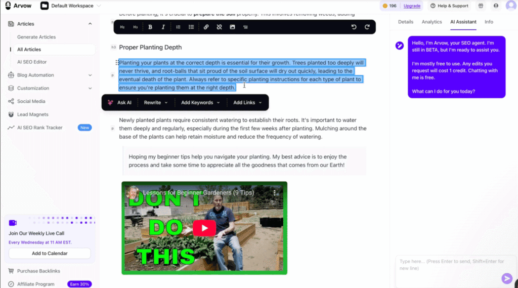 Core features in Arvow drive end-to-end automation. The AI Article Writer builds long-form pages from keywords and headlines. Knowledge Base uploads train output on brand documents, URLs, and internal data to align with E-E-A-T requirements.