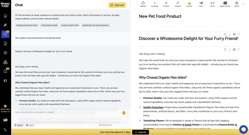 Against Anyword, Hoppy Copy emphasizes execution speed rather than prediction. Anyword applies performance scoring to copy variants. Hoppy Copy provides ready-made templates and formula-based writing that produces campaign content rapidly. That approach places Hoppy Copy ahead for marketers that prioritize fast output over statistical testing.