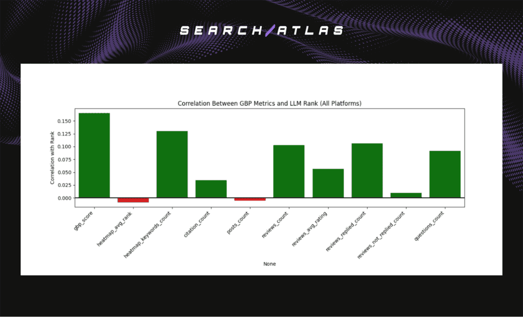 LLMs show modest sensitivity to GBP quality signals, especially composite and engagement-oriented metrics. Review quality and responsiveness correlate more strongly than raw volume or posting activity. Heatmap rank and map-based visibility contribute little, which indicates that LLMs treat GBP as supporting context rather than a primary ranking engine.