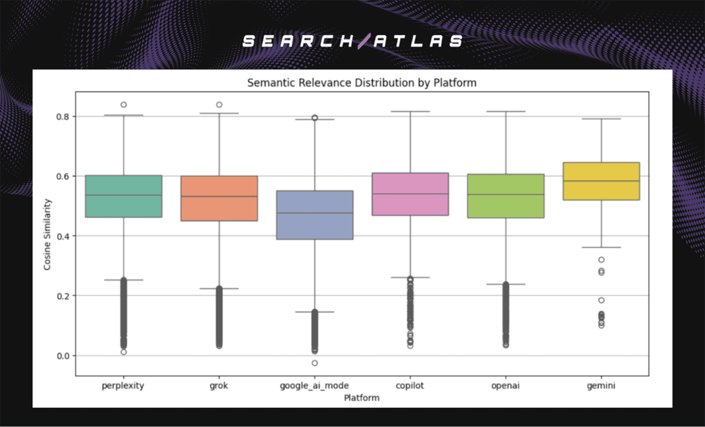These results show that several platforms consistently rank more semantically relevant citations higher. The shared correlation strength across OpenAI, Grok, and Google AI Mode indicates similar relevance-driven ordering logic.
