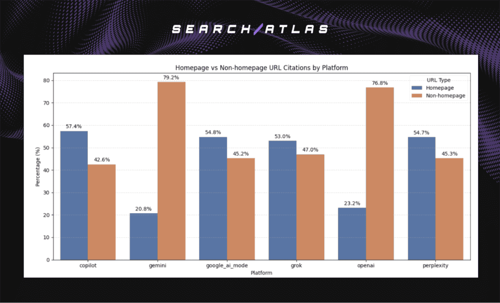 - Gemini and OpenAI. Higher share of non-homepage citations.