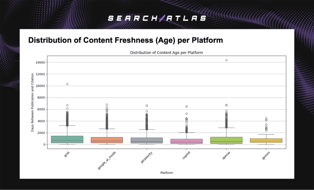 Freshness acts as a secondary, platform-dependent modifier. Gemini favors recently published content more strongly than other platforms. OpenAI and Grok balance fresh pages with evergreen sources, while Perplexity, Copilot, and Google AI Mode show limited or inconsistent sensitivity to recency. Freshness influences ranking in some environments but does not define ordering universally.