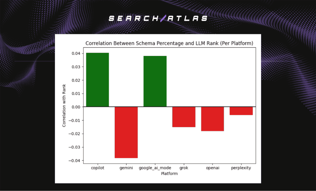 - OpenAI, Gemini, Grok, Perplexity. Neutral to negative correlation with schema usage.