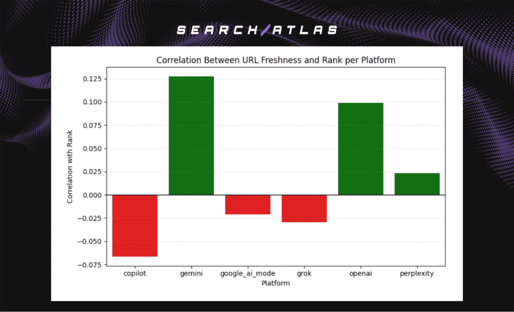These results show that freshness influences ranking strongly on Gemini, moderately on OpenAI, and minimally or negatively on other platforms. Freshness acts as a platform-specific modifier rather than a universal ranking driver.