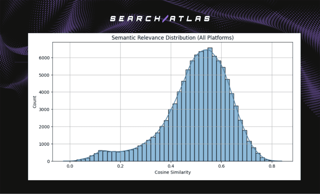 The analysis measured semantic relevance using vector embeddings generated from query text and cited page content. It calculated cosine similarity between these embeddings to produce a Semantic Relevance Score for each citation. This score quantifies intent alignment and enables evaluation of semantic relevance as a primary ranking driver across LLM platforms.