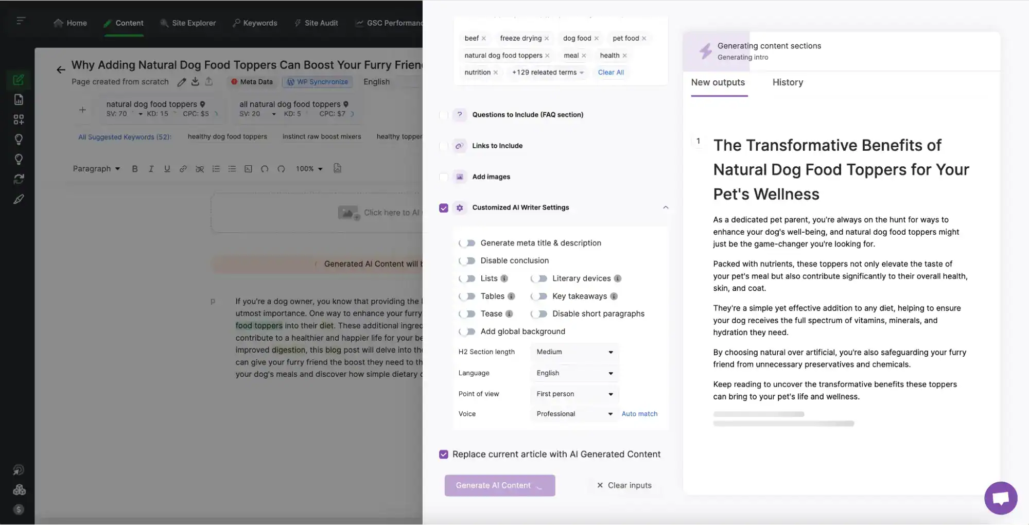 Once you have your keywords, you can send them to the SEO Content Assistant to start creating content. Get detailed suggestions for how to rank for your target keywords, including suggested Focus Terms, internal links, word count, and NLP entities. Write the content yourself or use the AI Content Writer to generate fully-optimized SEO articles in 1-click.