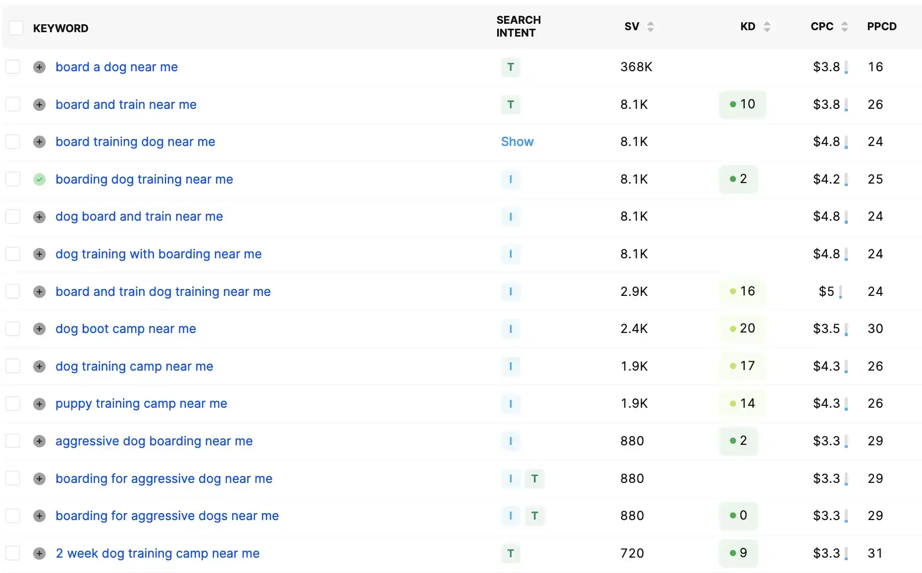 Review and analyze keyword metrics in your keyword report. Look for keywords with strong search volume and good organic traffic potential. Note that keywords with a higher Keyword Difficulty rating will be more competitive to rank for. Also, keywords with higher CPC can signal good conversion potential for your clients.