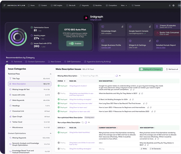 OTTO SEO automates technical fixes, content optimizations, backlink building, and content creation. Once approved in your dashboard, OTTO will fix title tags, meta descriptions, broken links, canonical tags, and more. It will optimize your Google Business Profile and automate review response and Q&As.