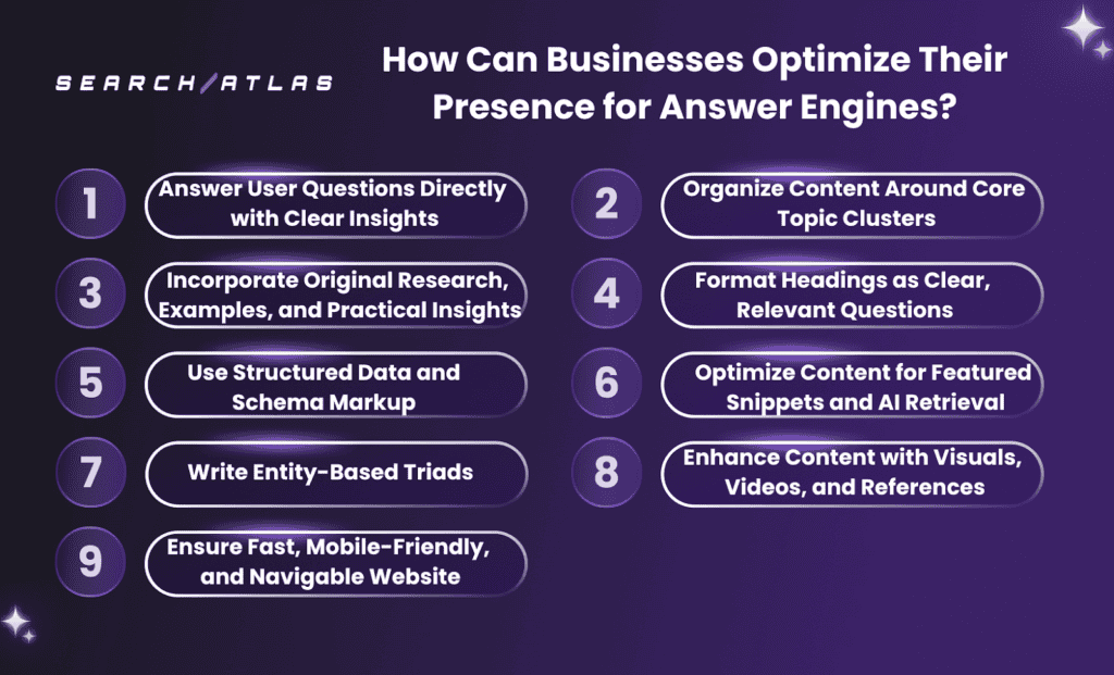 The 9 methods for businesses to optimize their presence for answer engines are listed below.