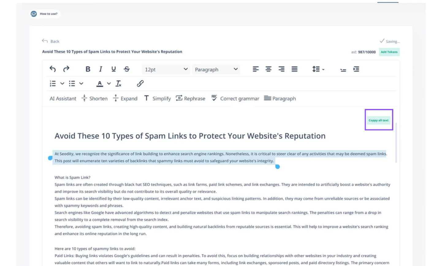 Copy and paste the content from Seodity into a document of your choice or directly into Search Atlas. Do it manually or by clicking Copy all text in the corner of the editor.