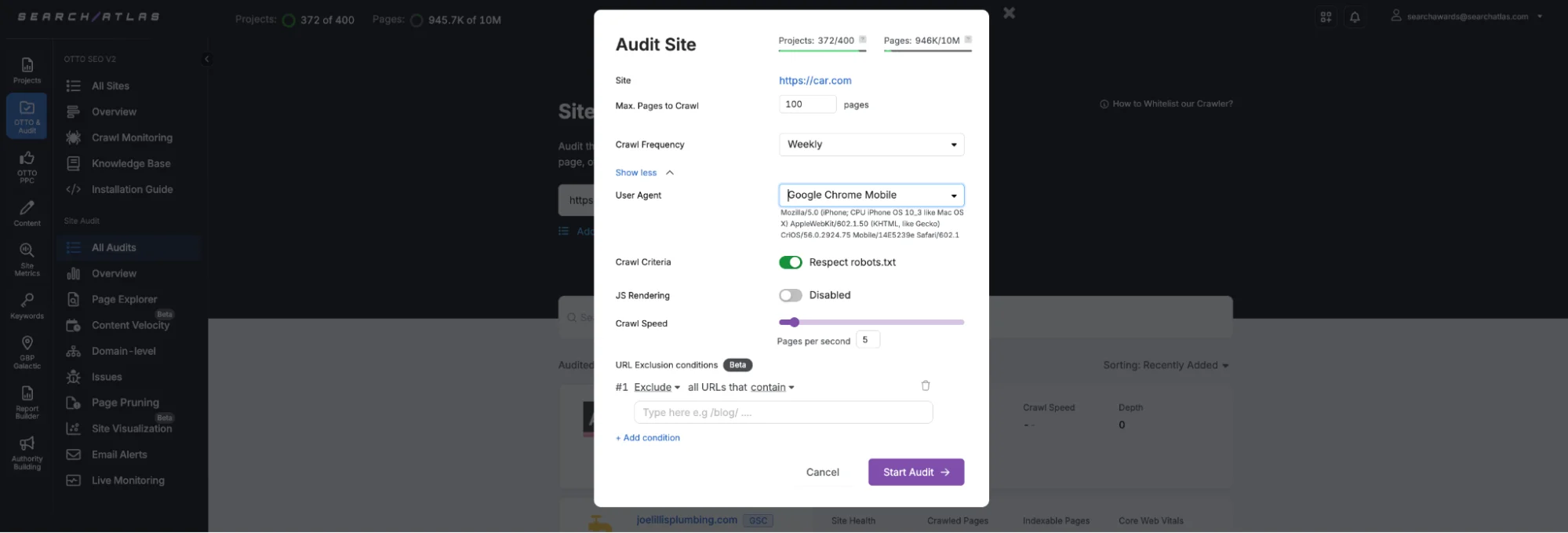 The Search Atlas Site Auditor scans the entire automotive website to detect SEO and performance blockers. The Search Atlas Site Auditor identifies crawl errors, broken links, redirect chains, slow-loading images, and mobile usability violations.