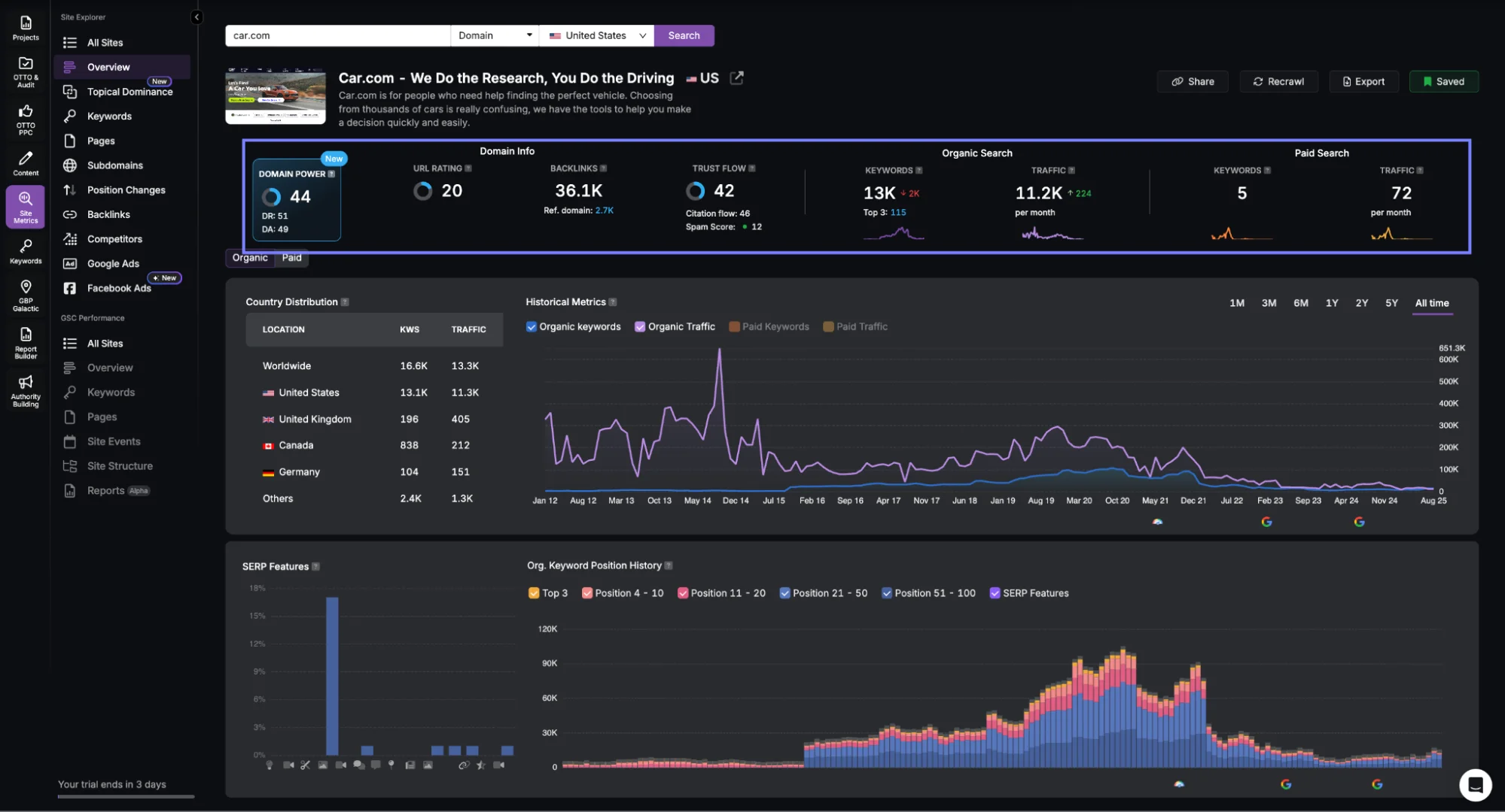 The Search Atlas Site Explorer displays live automotive rankings, dealership authority trends, and vehicle coverage across service areas. Use Domain Power, Trust Flow, and other metrics from the Search Atlas Site Explorer to evaluate which automotive categories need deeper content coverage, such as certified pre-owned, service specials, or parts inventory.