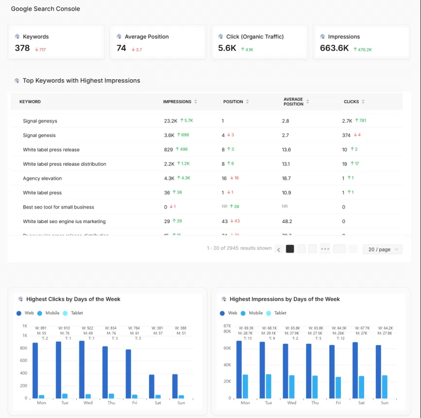 - Live Google Search Console Integration. Monitor over 45,000 active automotive keywords by position, impressions, and clicks. Segment data by vehicle make, service type, or automotive entity, with automated flagging for position drops, click surges, or buyer intent shifts.