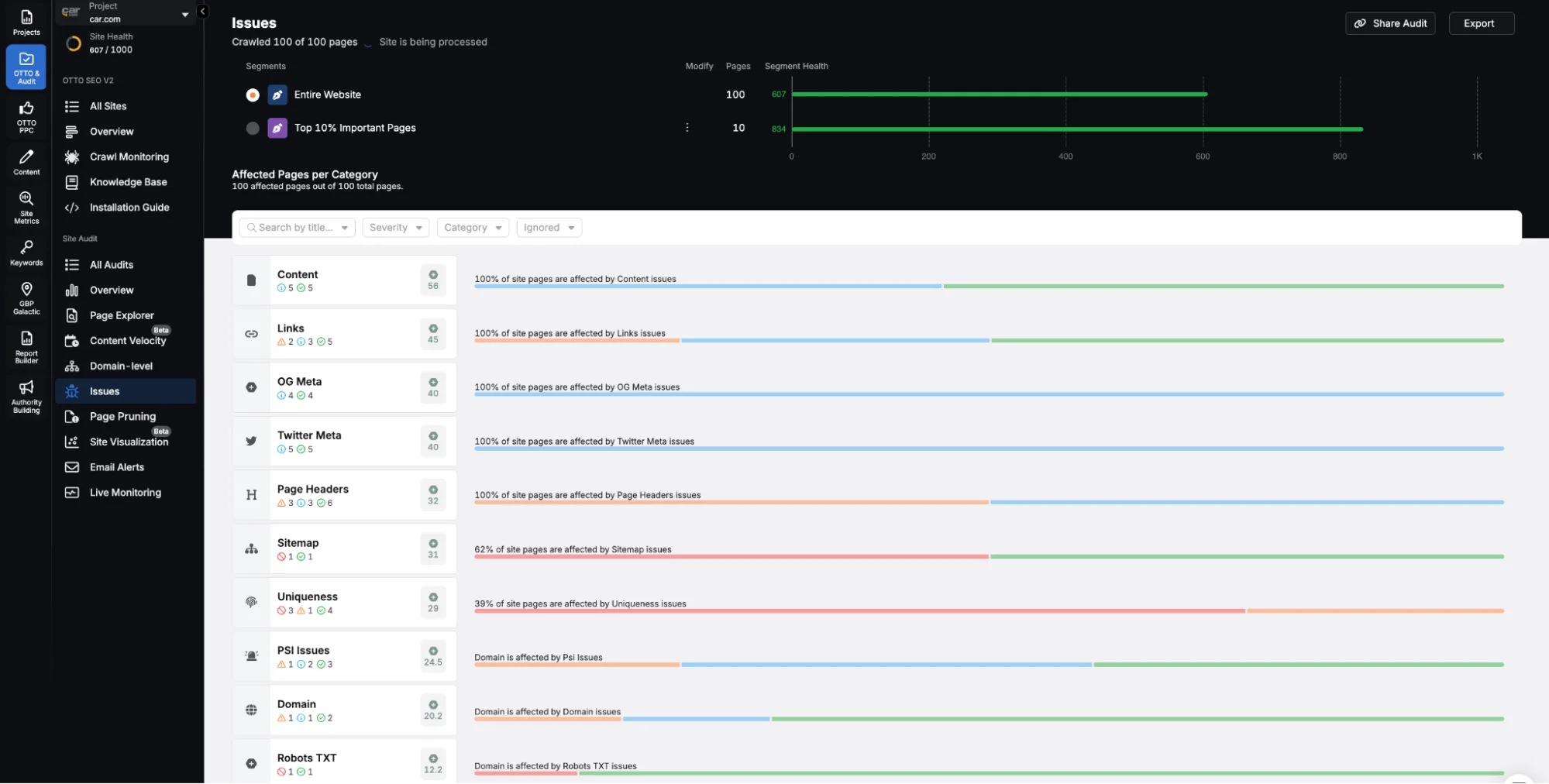 The Search Atlas Site Auditor scans the entire automotive website to detect SEO and performance blockers. The Search Atlas Site Auditor identifies crawl errors, broken links, redirect chains, slow-loading images, and mobile usability violations.