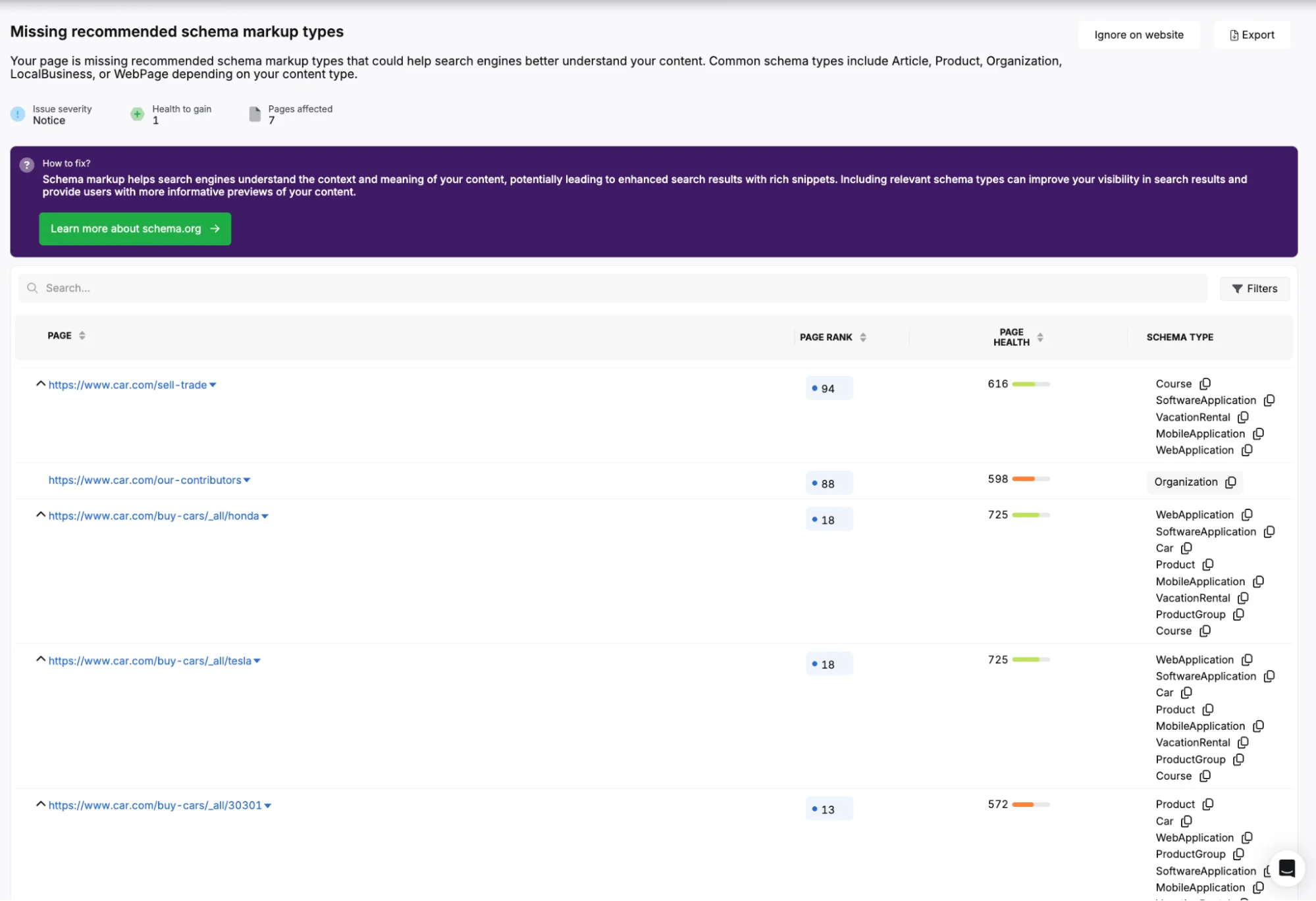 For example, a Honda dealership detected that vehicle listing pages are missing the Vehicle schema and contain image galleries that slow mobile load times. Fixing these issues improved eligibility for Google vehicle carousels and enhanced mobile user experience for car shoppers.
