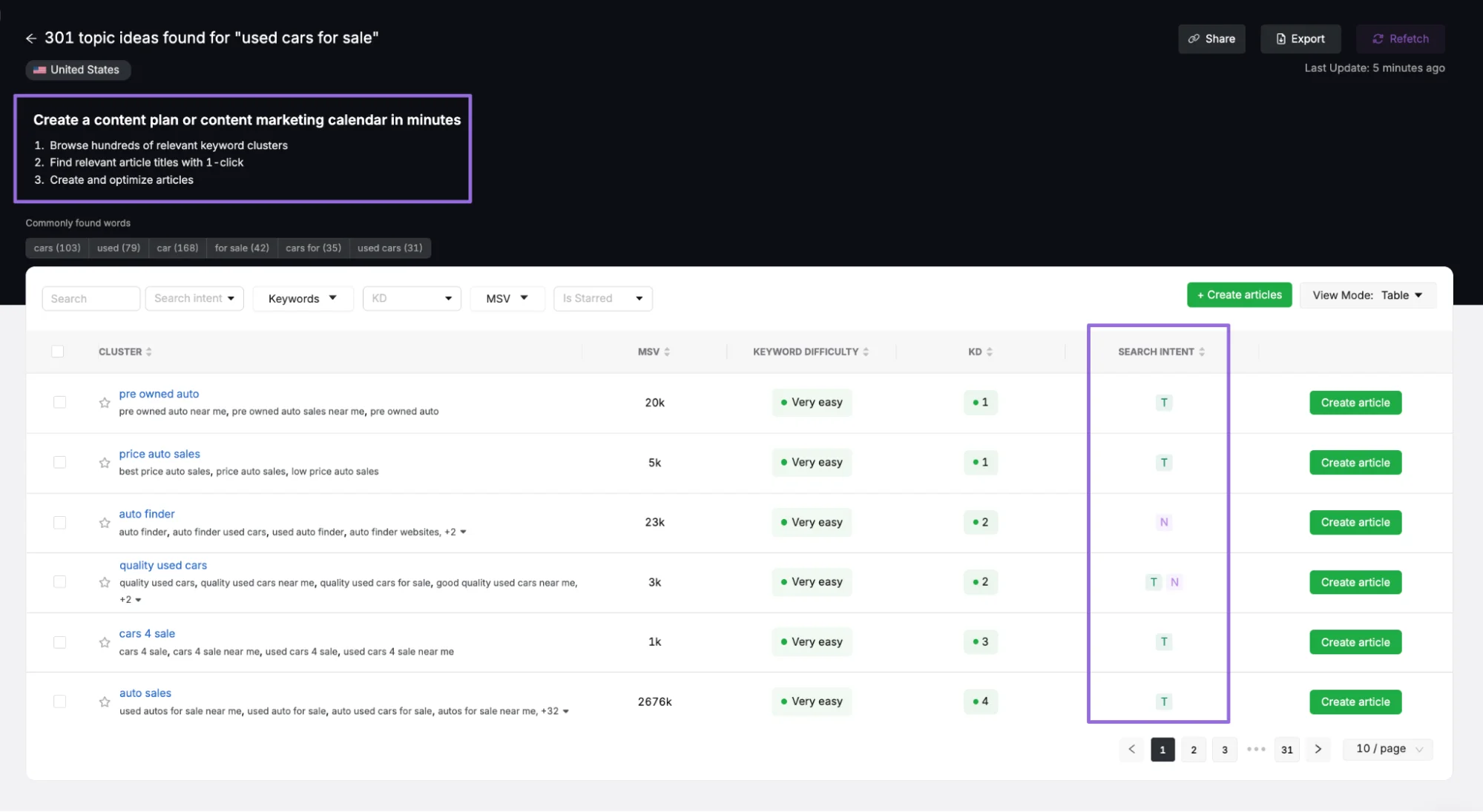 - The Search Atlas Content Planner transforms automotive seed keywords into structured vehicle topic clusters grouped by buyer intent, search volume, and automotive proximity.
