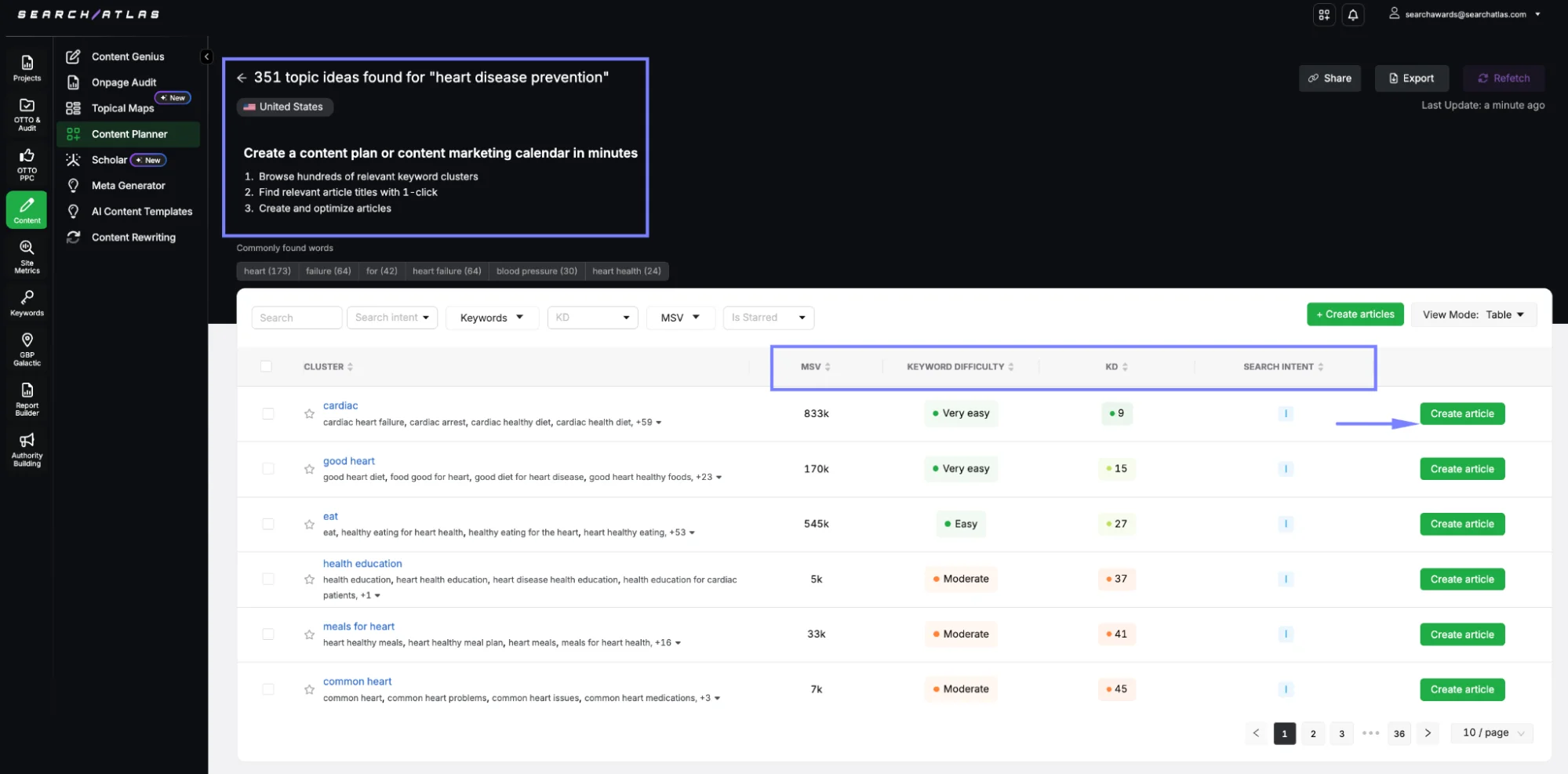- The Search Atlas Content Planner transforms medical seed keywords into structured health topic clusters grouped by patient intent, search volume, and semantic proximity.