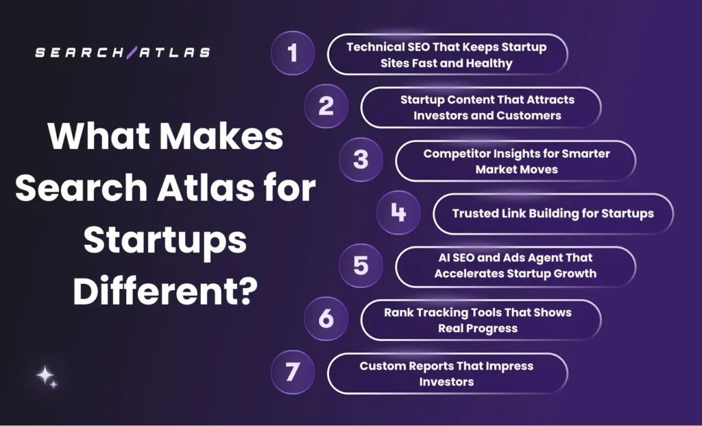 Search Atlas provides competitor intelligence tools that reveal startup-specific gaps.