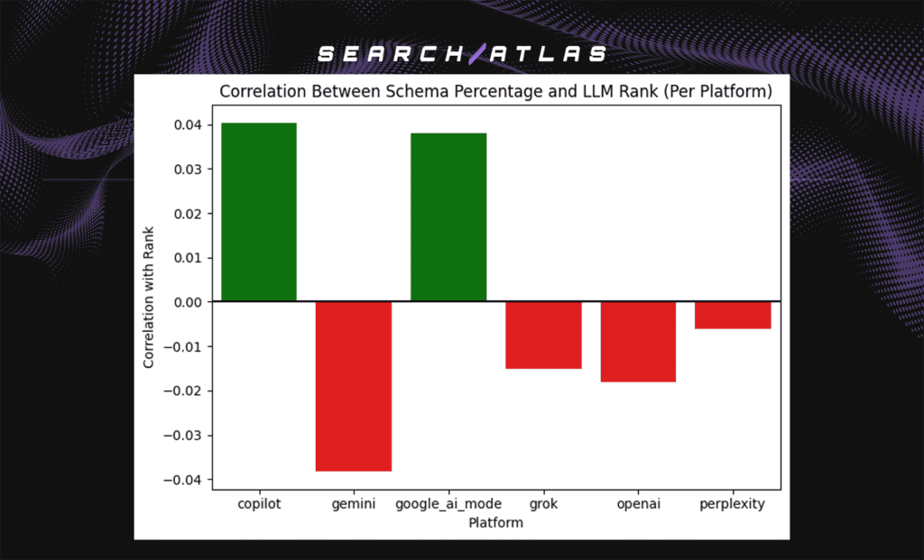 - Foundational LLM platforms (OpenAI, Gemini, Grok & Perplexity) show neutral to negative correlations, indicating that schema markup provides little to no ranking advantage when citation ordering is driven primarily by other search factors rather than search-style signals.