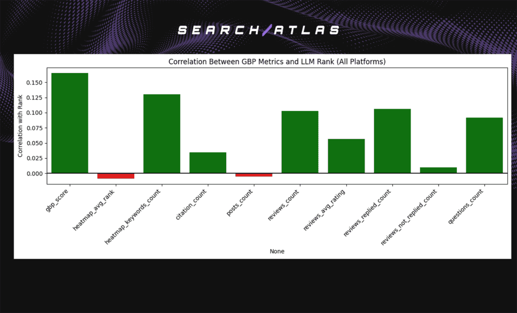 - Traditional local SEO visibility signals contribute little or negatively. Heatmap average rank and posts count show weak negative correlations, implying that map-based visibility does not translate directly into LLM ranking behavior.