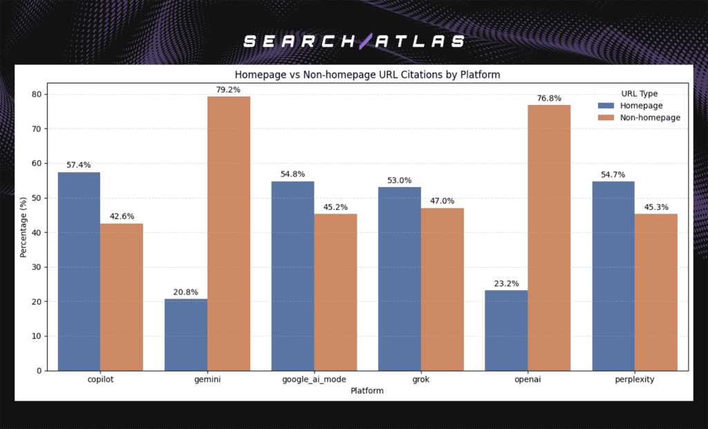 To illustrate this effect, the chart below shows the proportion of homepage versus non-homepage URL citations retrieved by each platform.